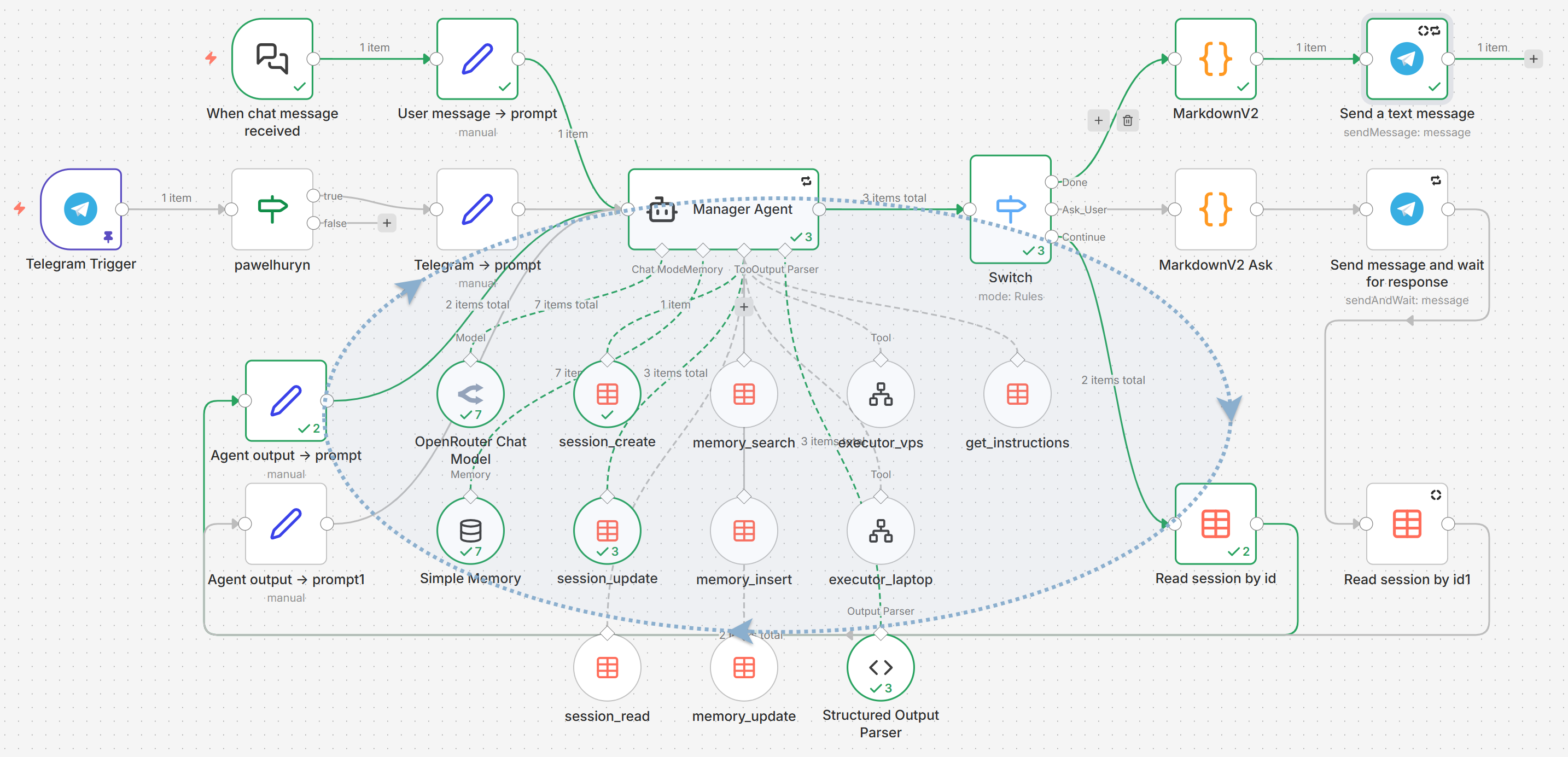 Simple tasks don’t need this — the Manager calls one executor, gets the result, responds Done. Complex tasks (research → generate report → upload → email) use sessions with Continue to keep each phase clean.