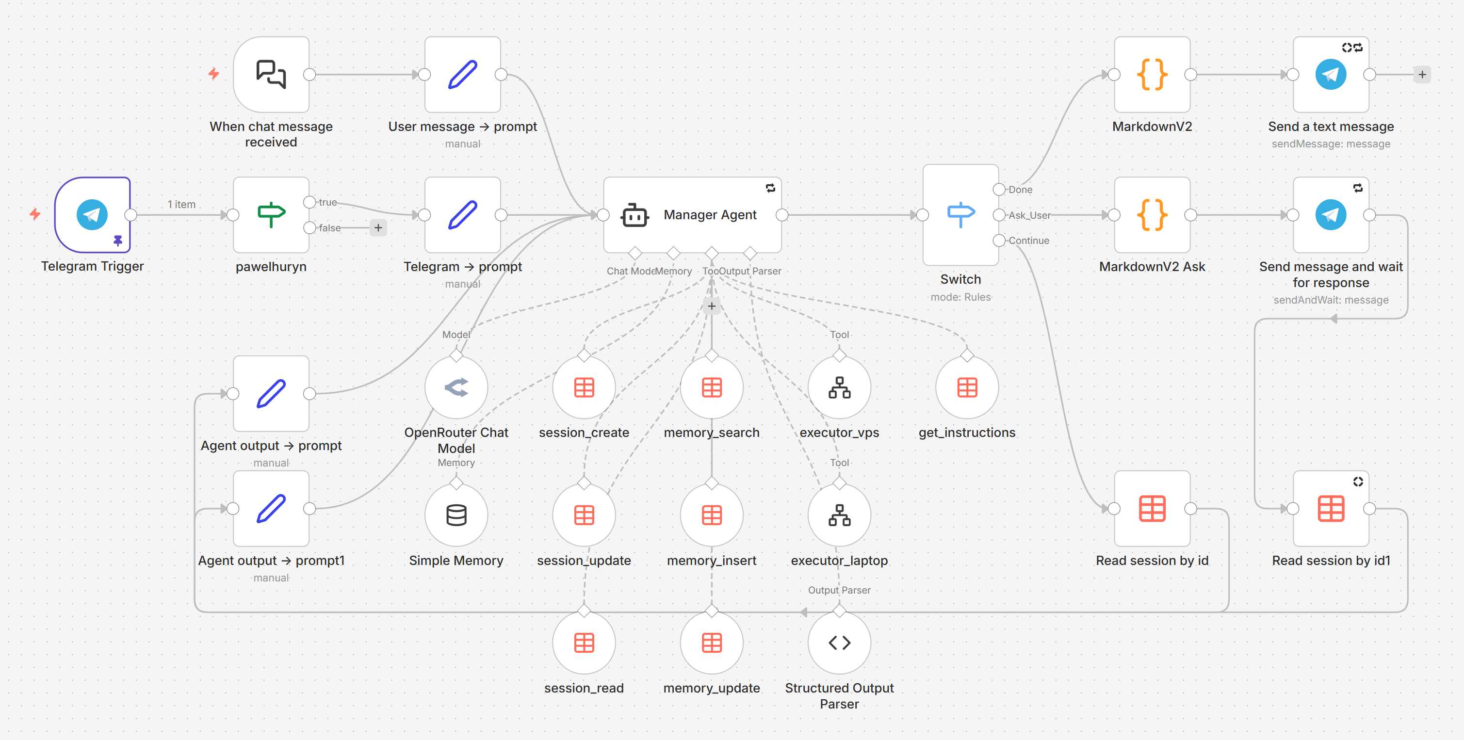 This felt like an artificial limitation until I removed it. The moment the Manager could touch files, it started doing executor work — running shell commands, creating documents mid-conversation, bypassing the executor entirely. The clean separation broke down, and with it, the session state, the memory system, and the error handling.