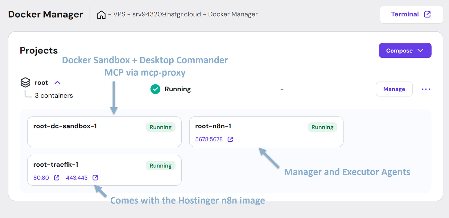 The VPS on Hostinger hosts n8n and sandbox containers. The sandbox is available only from n8n - this is where VPS Executor agent can manage files, install new tools, and execute scripts.