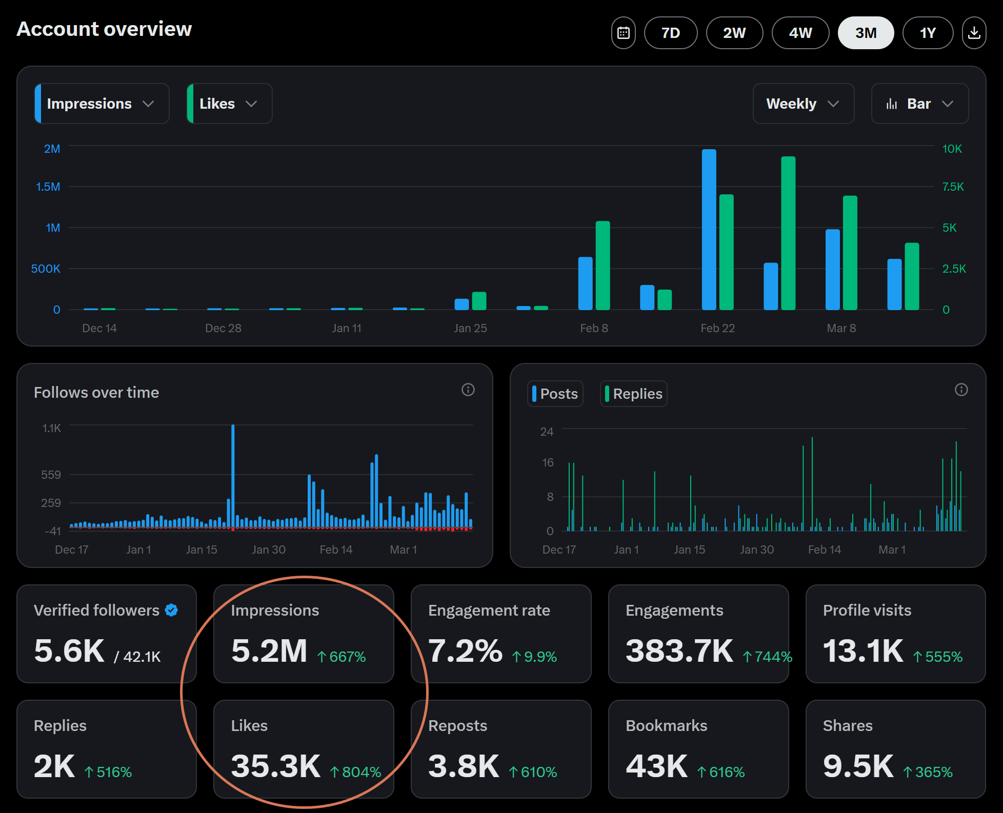 5.2 million impressions. 35,000 likes. 43,000 bookmarks. 7.2% engagement rate. In three months. Most of that growth happened within the last 6 weeks.