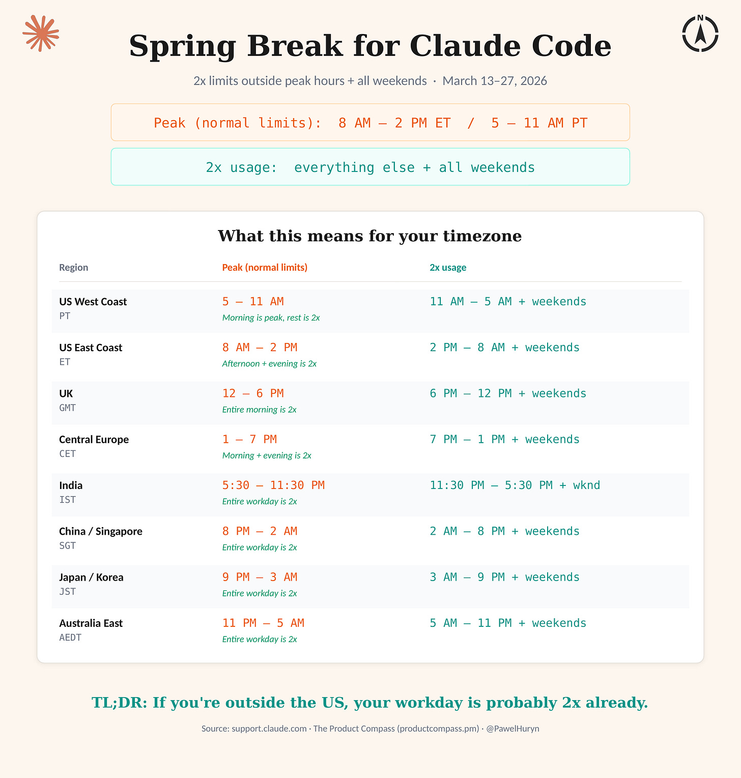 Claude is offering double usage limits through March 27. Weekdays outside peak hours, all day on weekends. Automatic across Web, Code, Cowork, and mobile.
