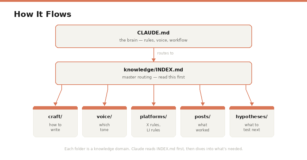 knowledge/INDEX.md is the router. It reads this first, then drills into only the folder that’s relevant to the current task.